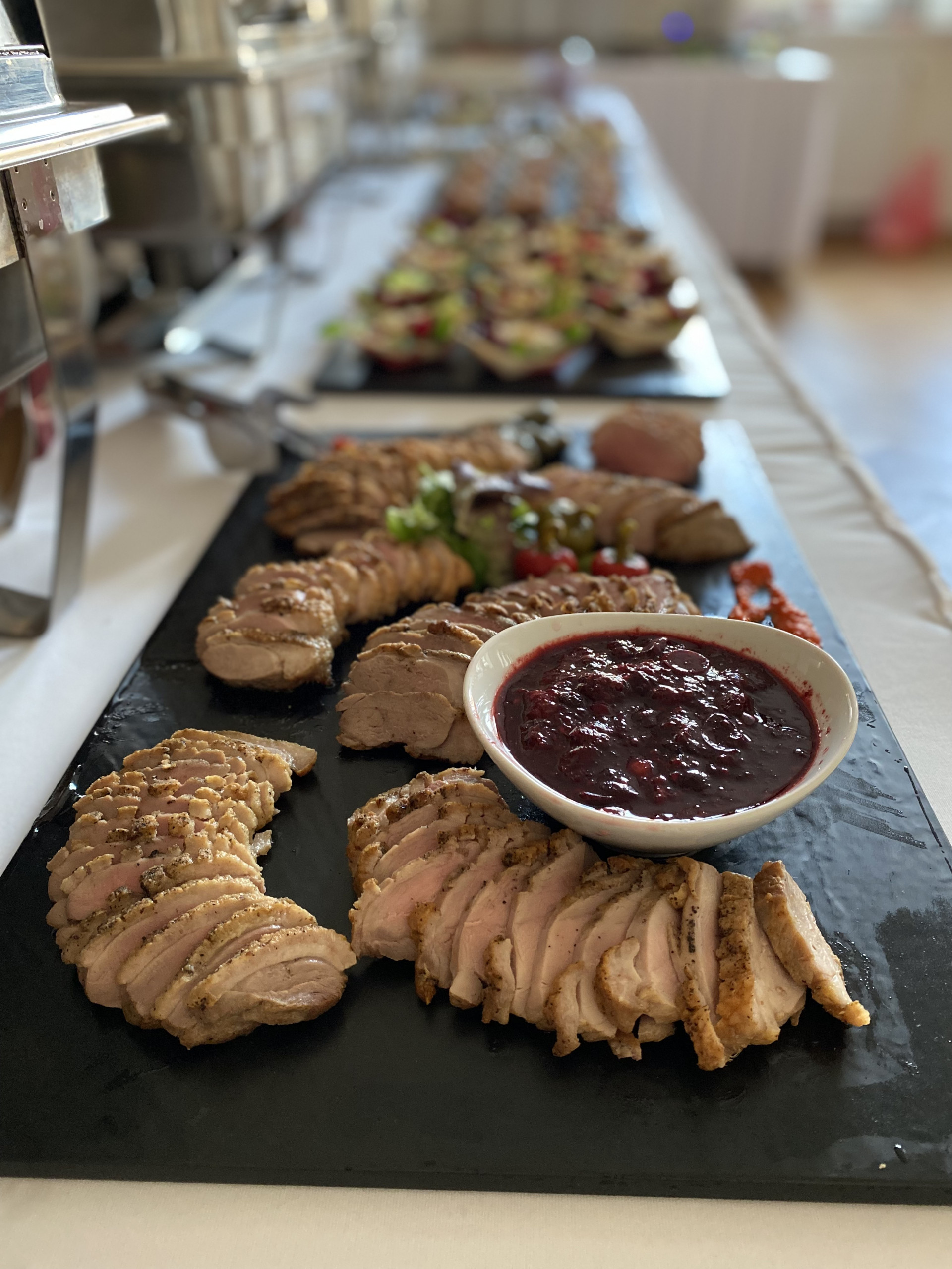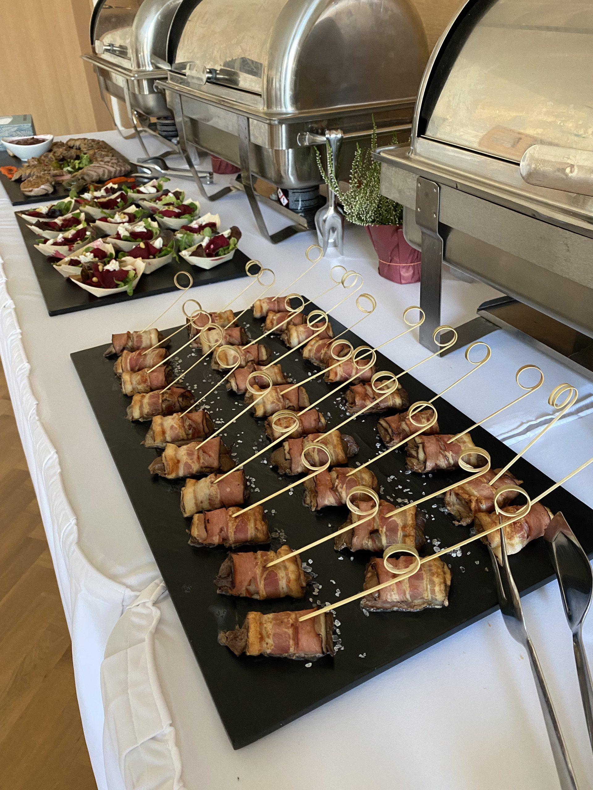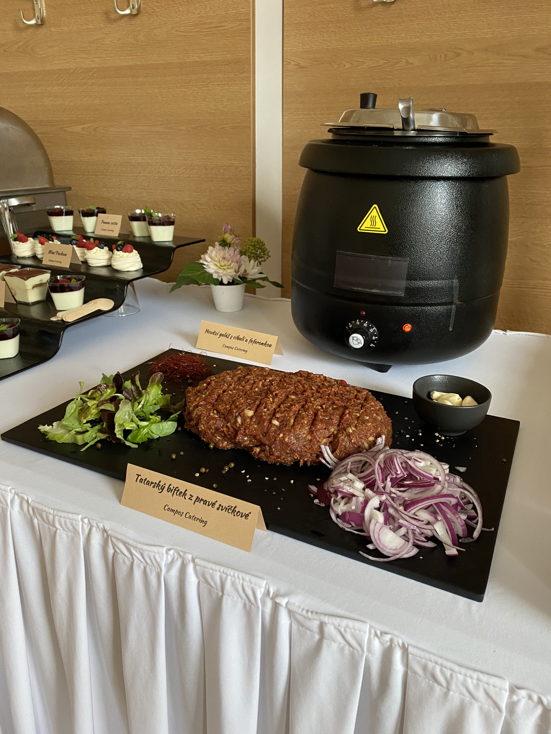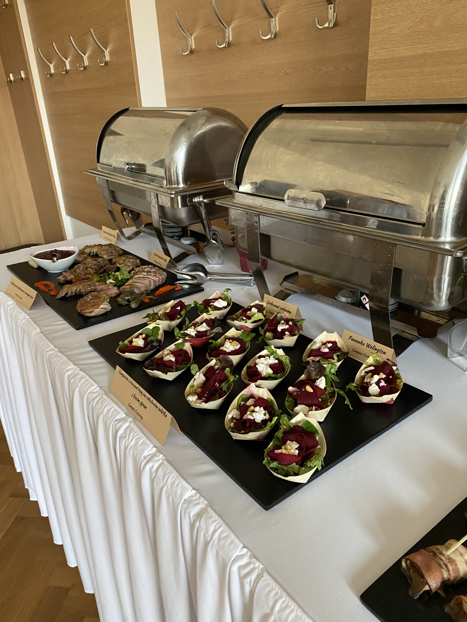 Na narozeninové oslavě v Bohatých Málkovicích jsme podávali různé druhy pokrmů. Začali jsme s lotusovým a malinovým cheesecakem, kachním paté a kuřecími játry obalenými ve slaninovém kabátku a skončili s carpaccia z červené řepy na rukolovém salátku s kozím sýrem a rostbeefem s máslovým chřestem a hořčičným dipem.