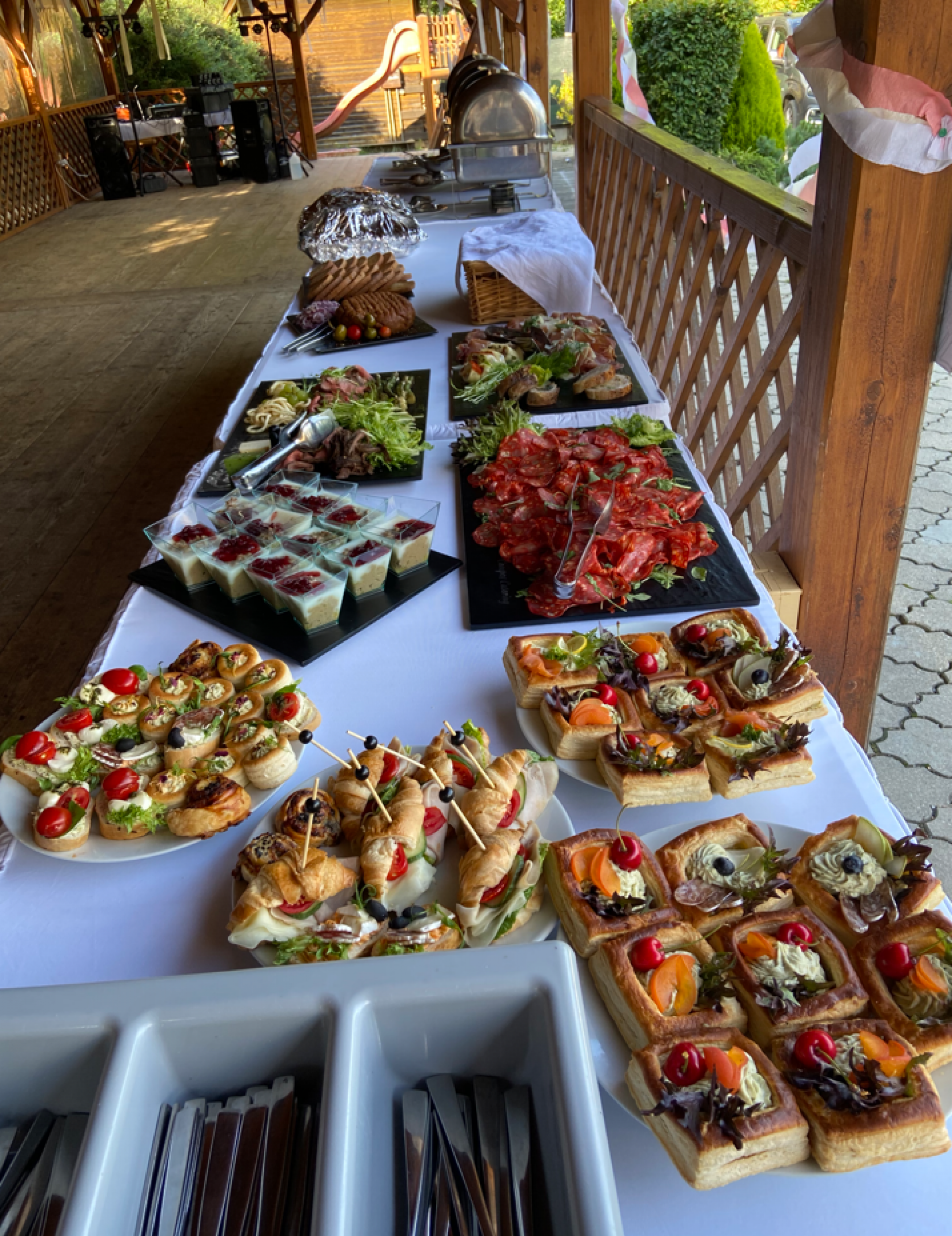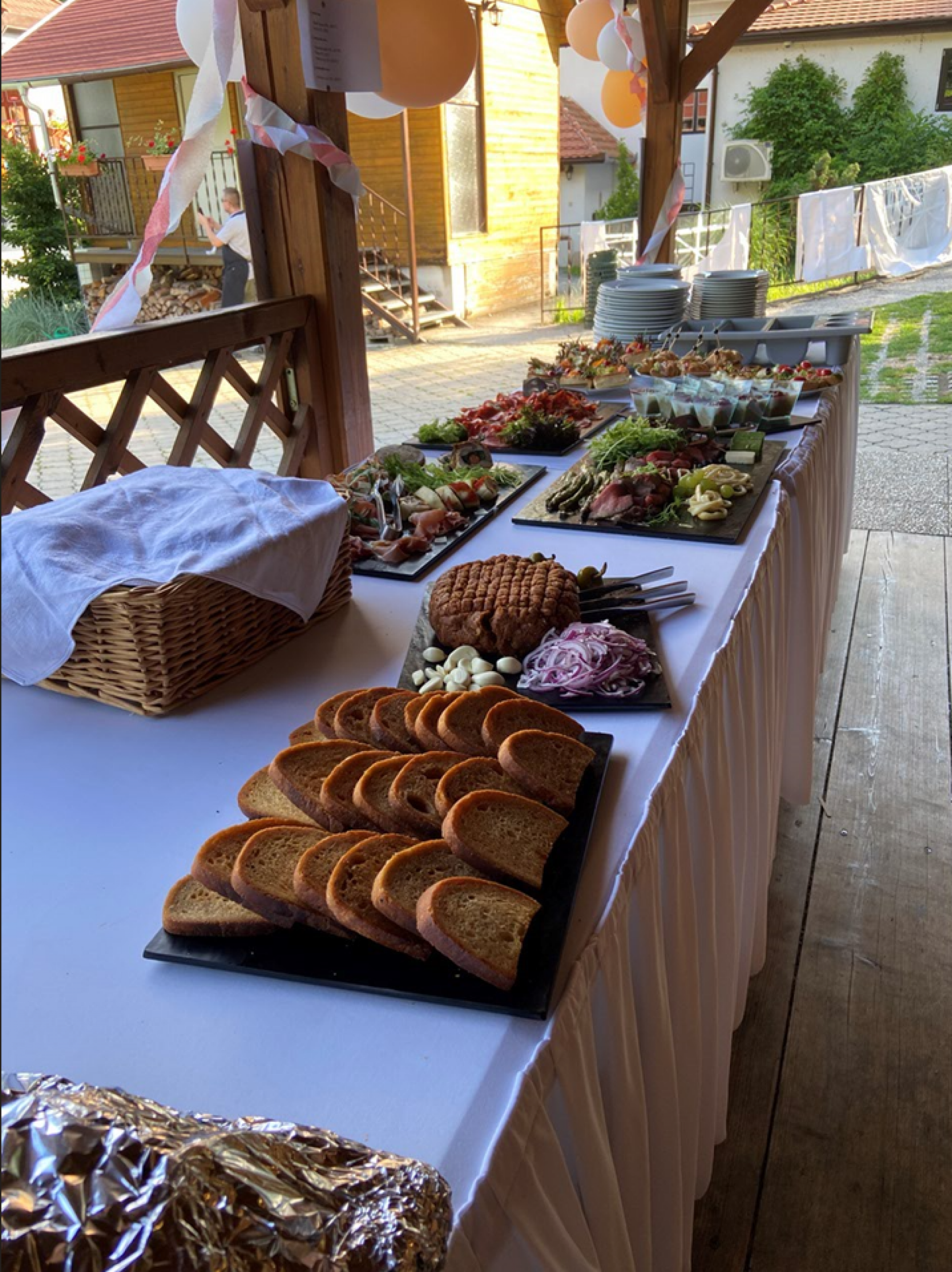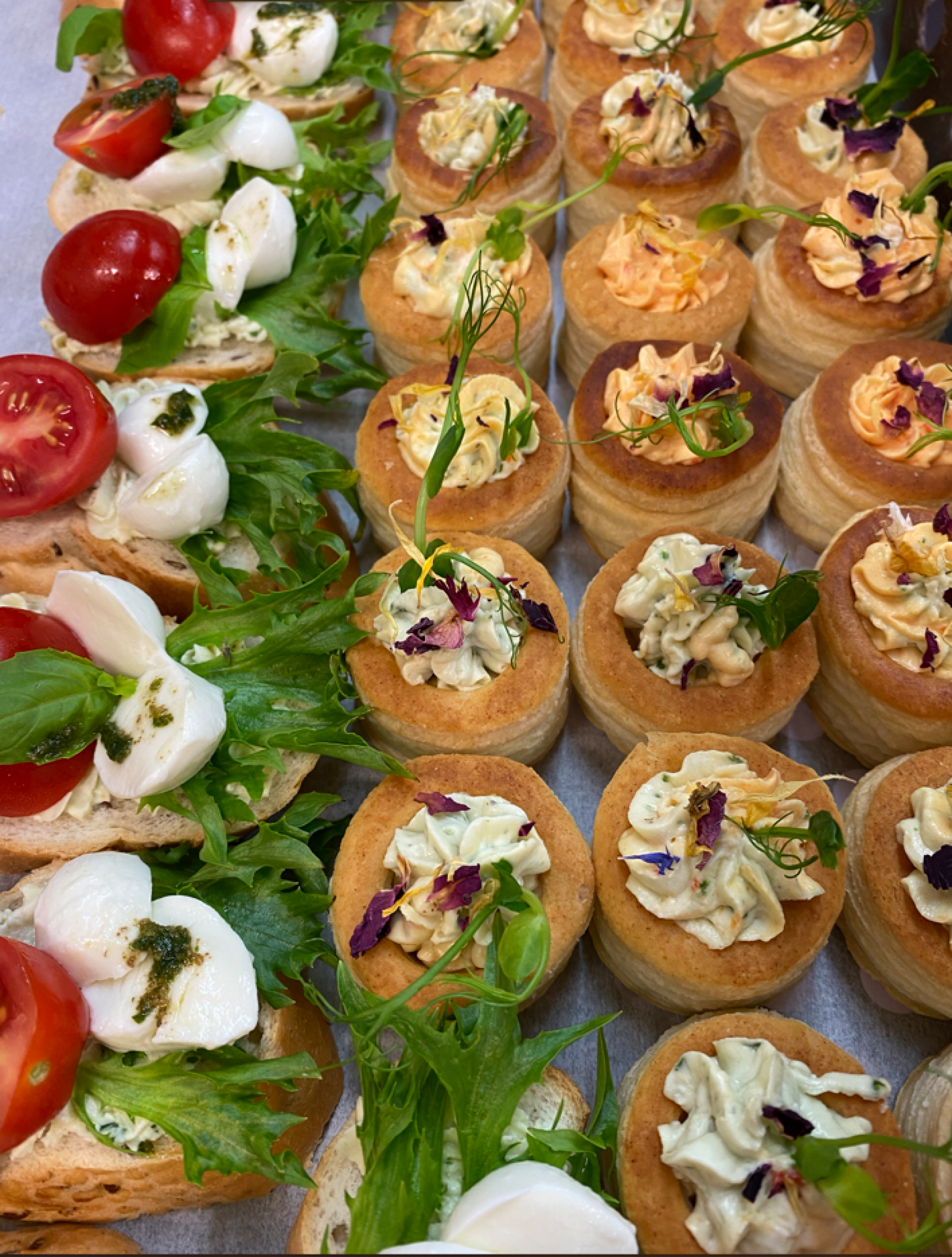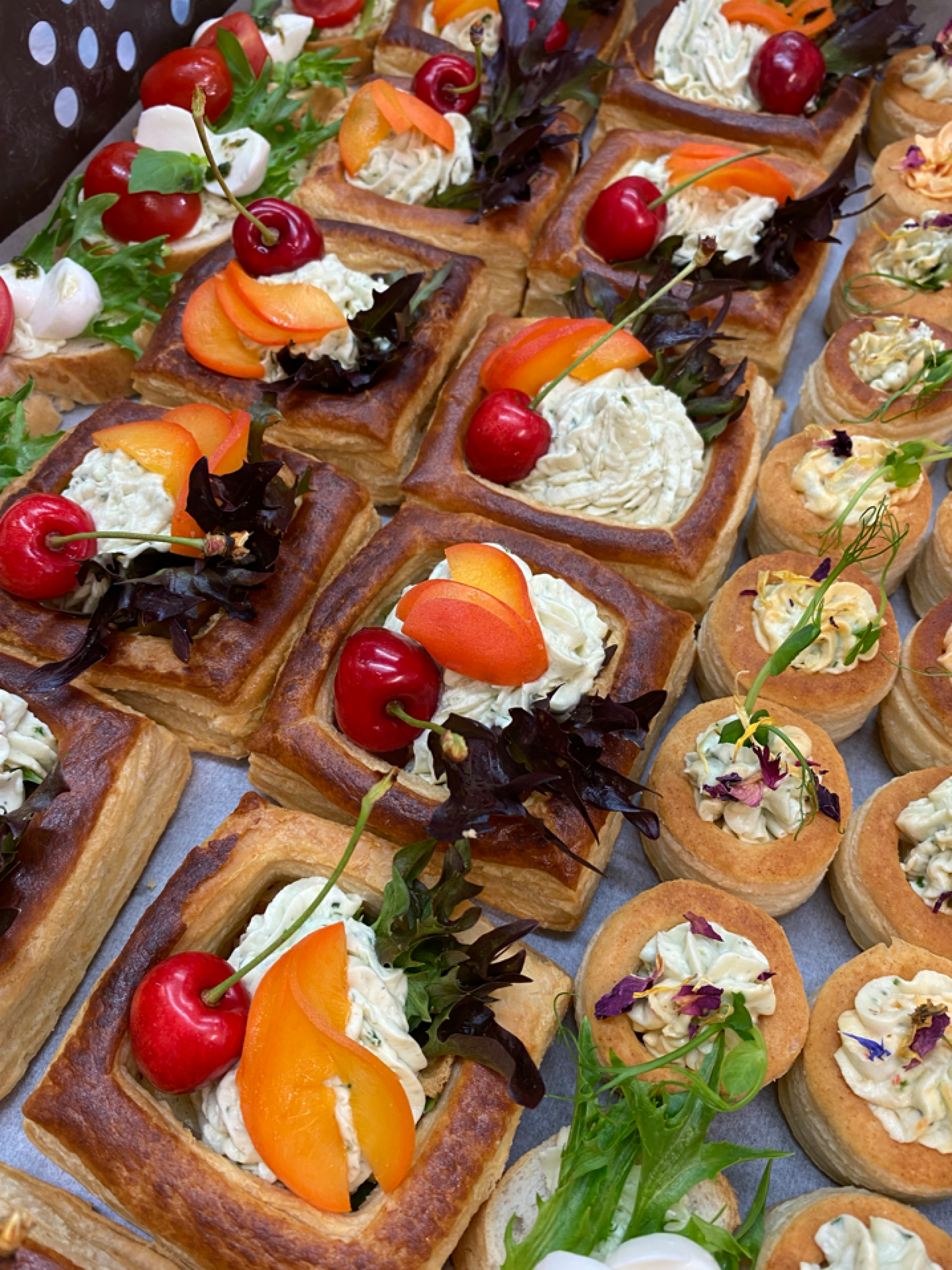Plněná foccacia trhaným kachním masem, zeleninou, čedarem a česnekovým bylinkovým pestem byla součástí svatebního rautu. Podobně jako hovězí tatarák s topinkami a zdobené listové košíčky se syrovo-bylinkovým krémem. Co vy na to?