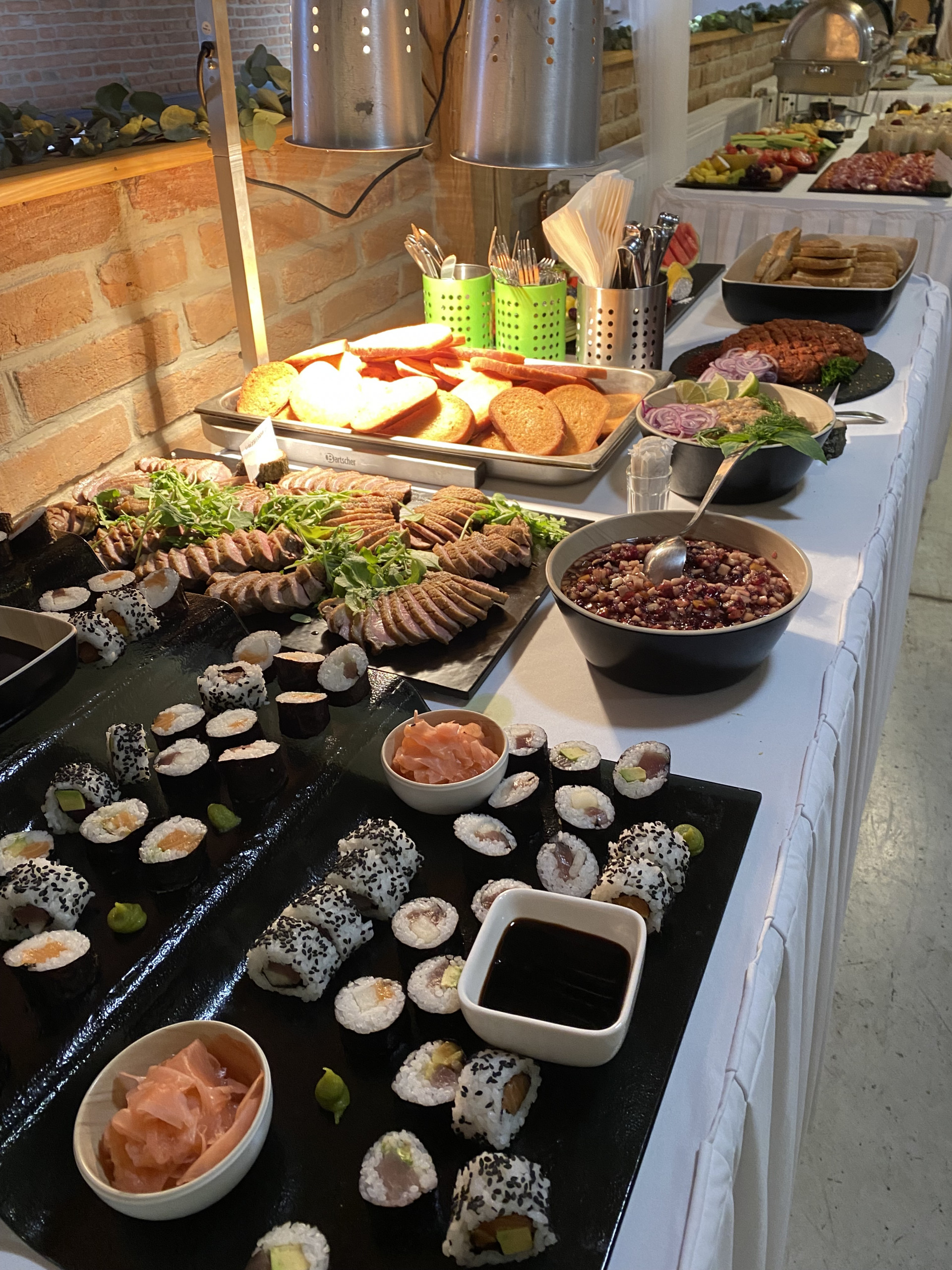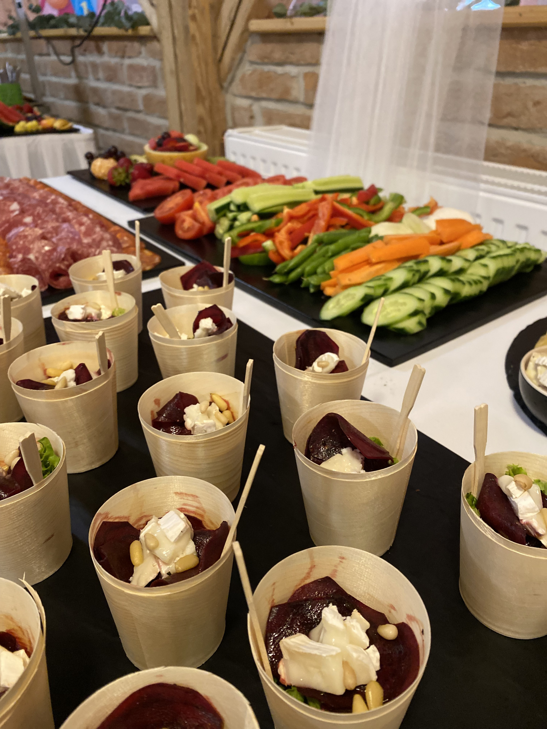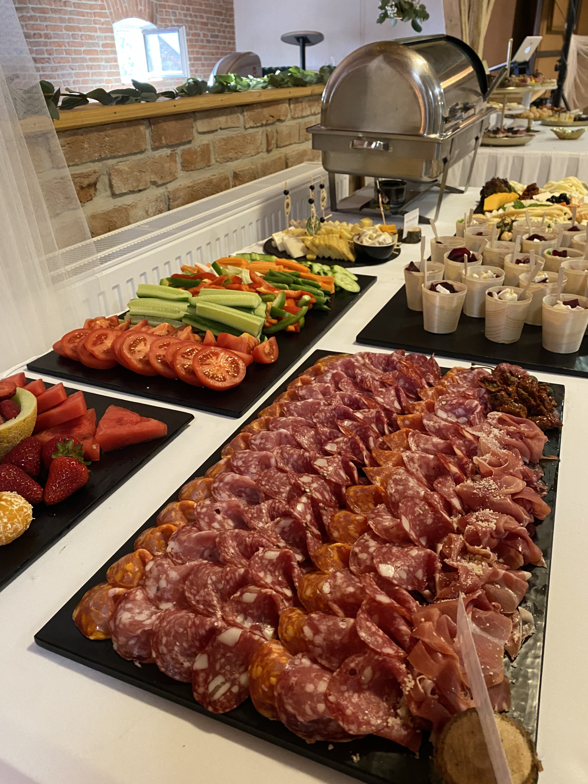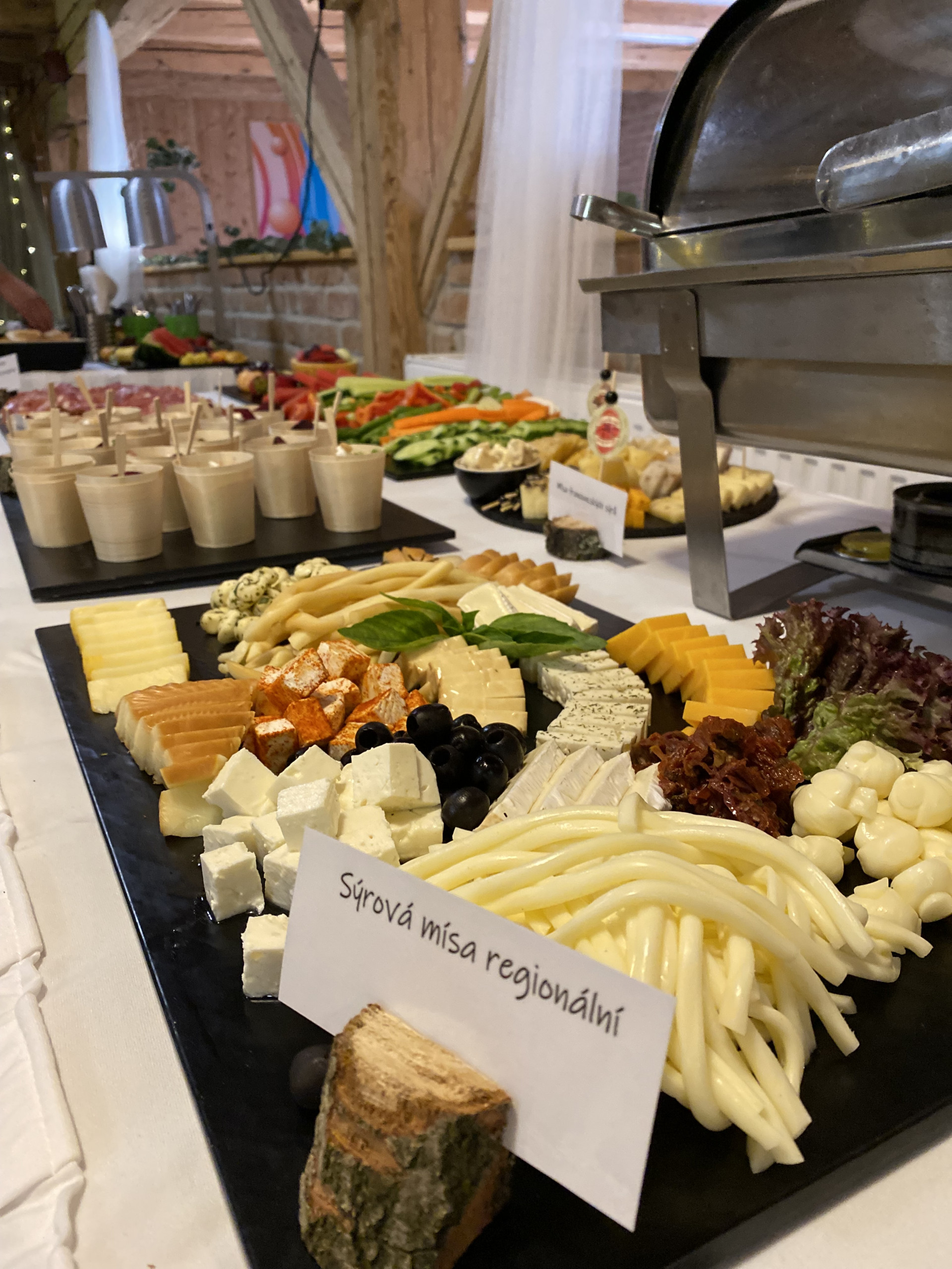 Večerní raut na svatbě sympatického páru byl obzvláště pestrý. Na výběr byl hovězí tatarák, kachní prsa, tatarák z lososa, mix sushi i ovocné chutney. Nechybělo ani carpaccio z červené řepy na listovém salátku s kozím sýrem a piniovými oříšky, chlebíčky, kanapky a obložené mísy.