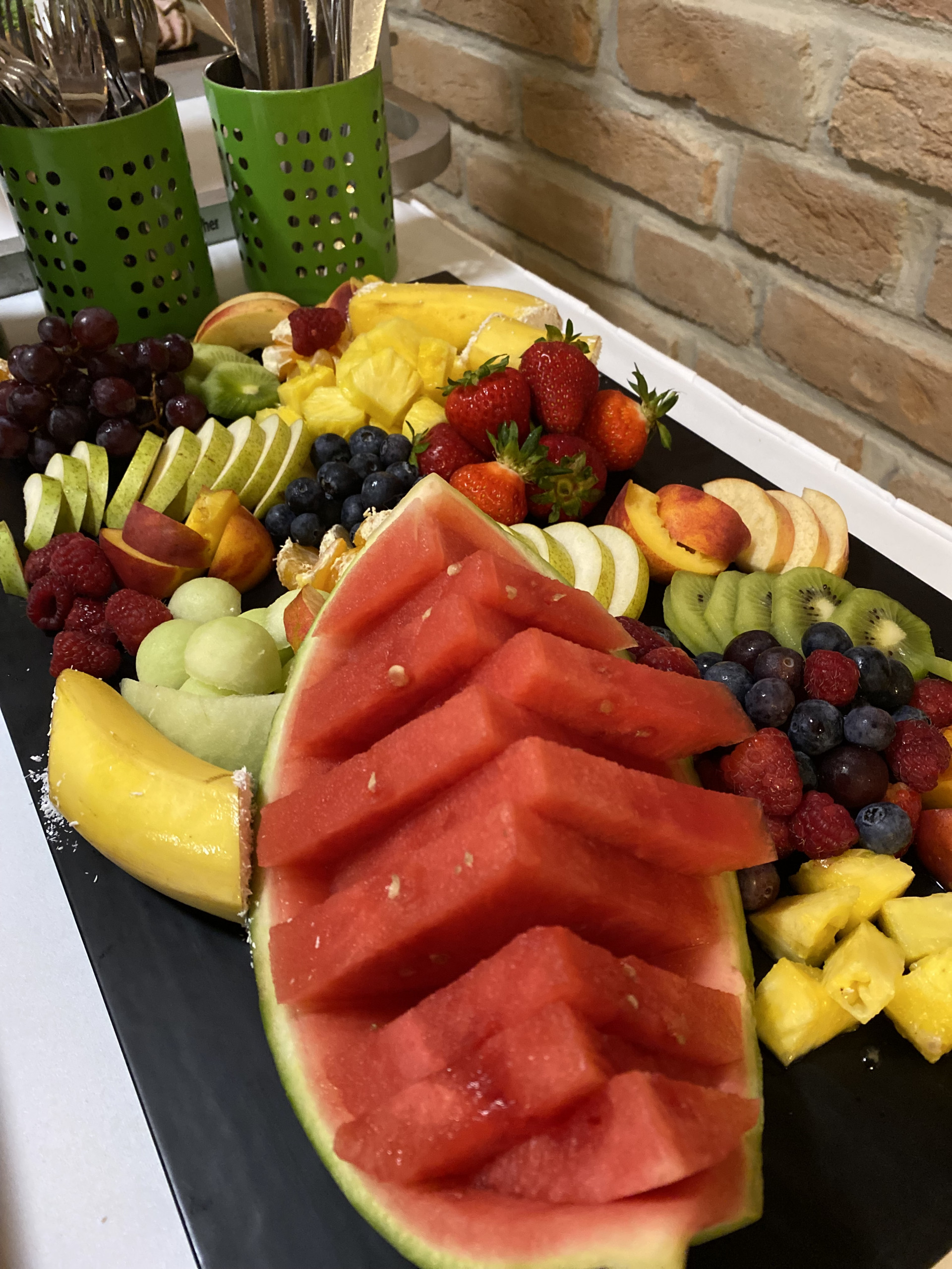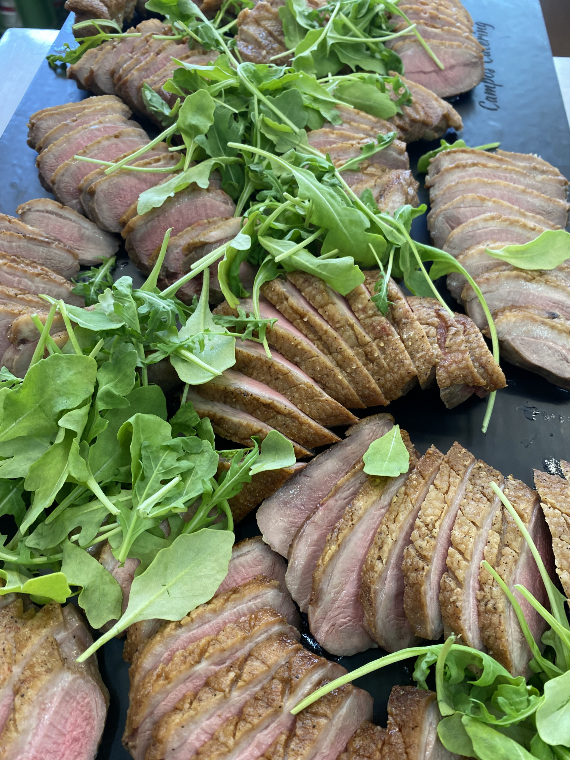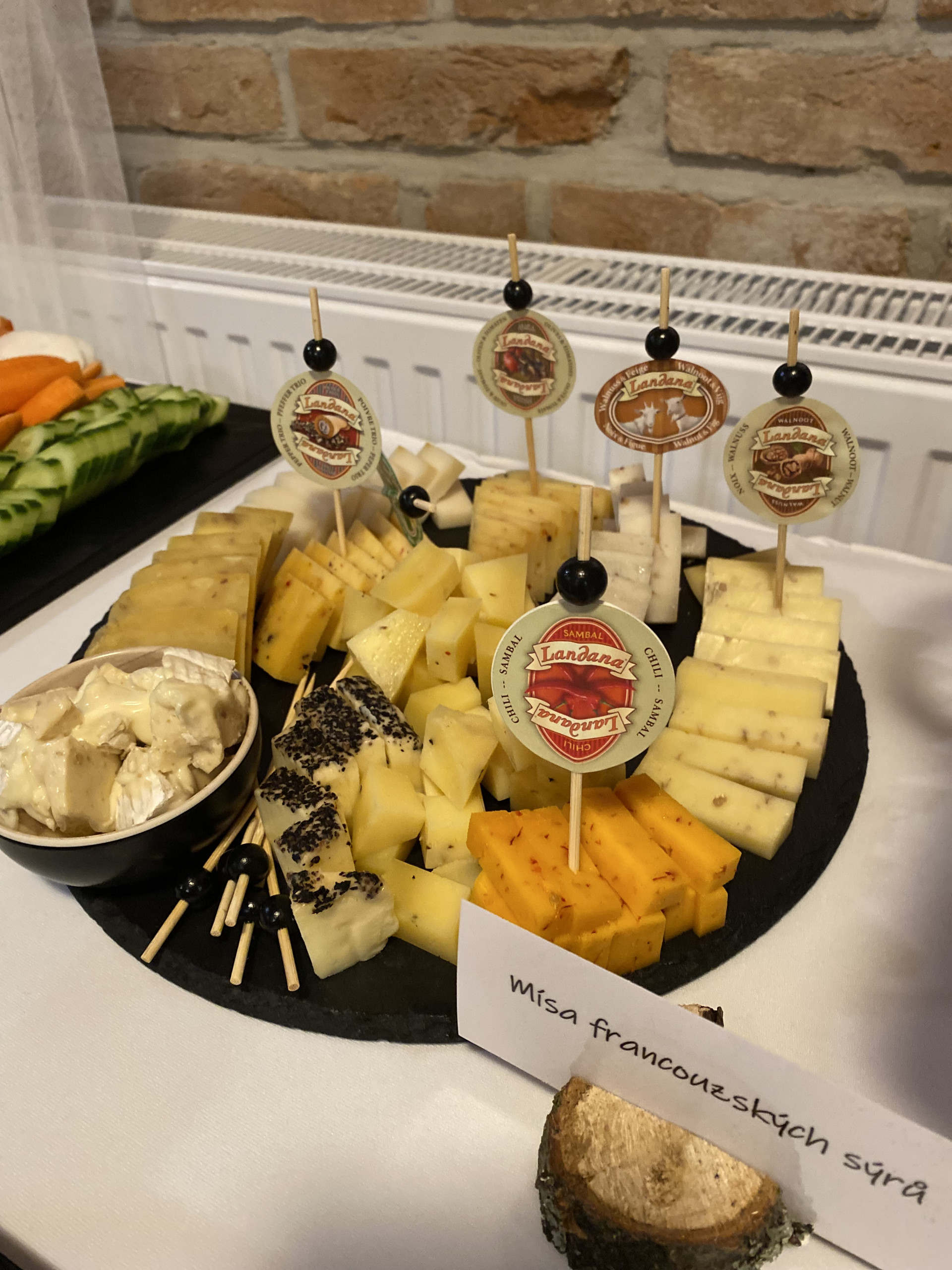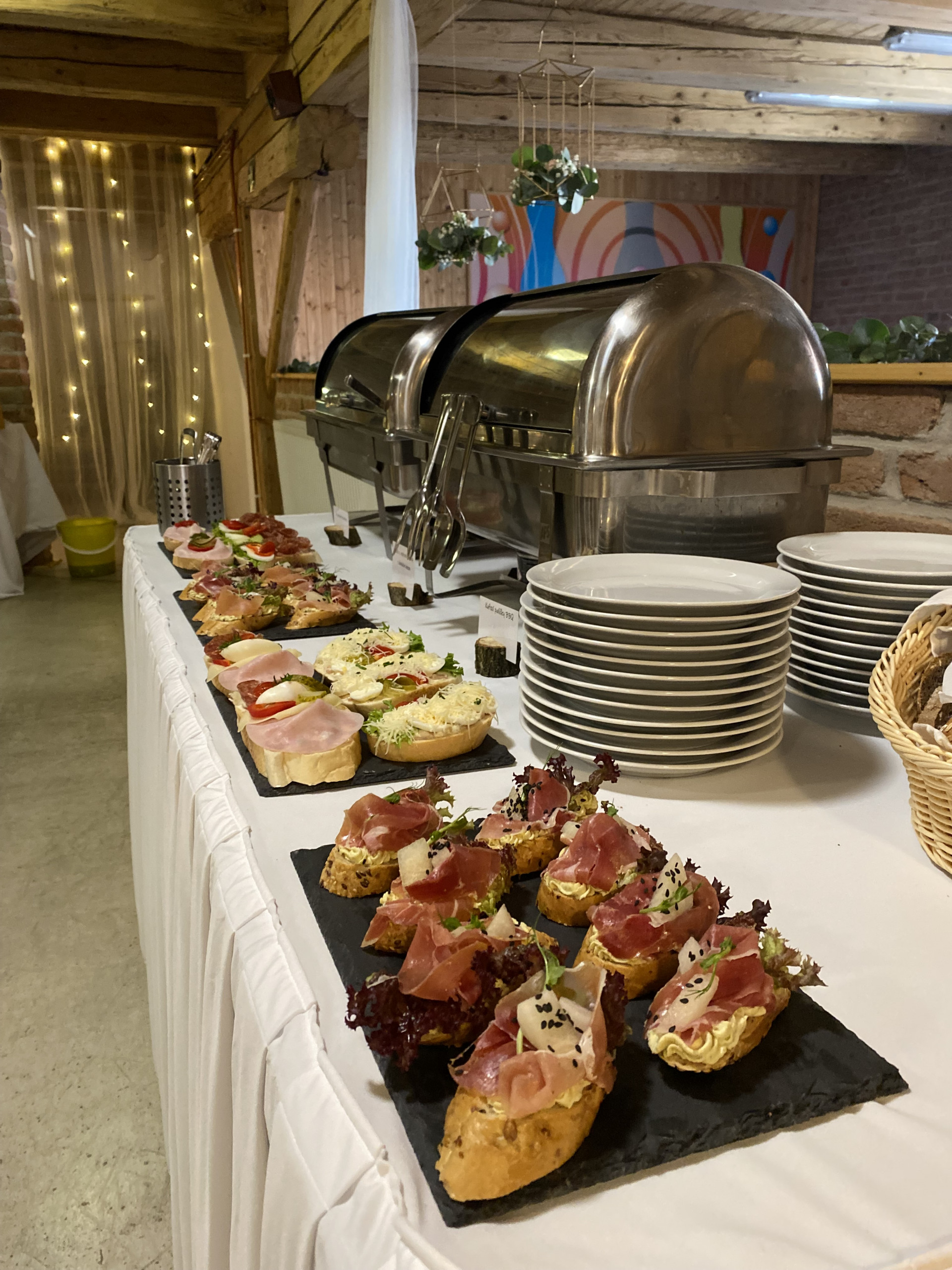 Večerní raut na svatbě sympatického páru byl obzvláště pestrý. Na výběr byl hovězí tatarák, kachní prsa, tatarák z lososa, mix sushi i ovocné chutney. Nechybělo ani carpaccio z červené řepy na listovém salátku s kozím sýrem a piniovými oříšky, chlebíčky, kanapky a obložené mísy.